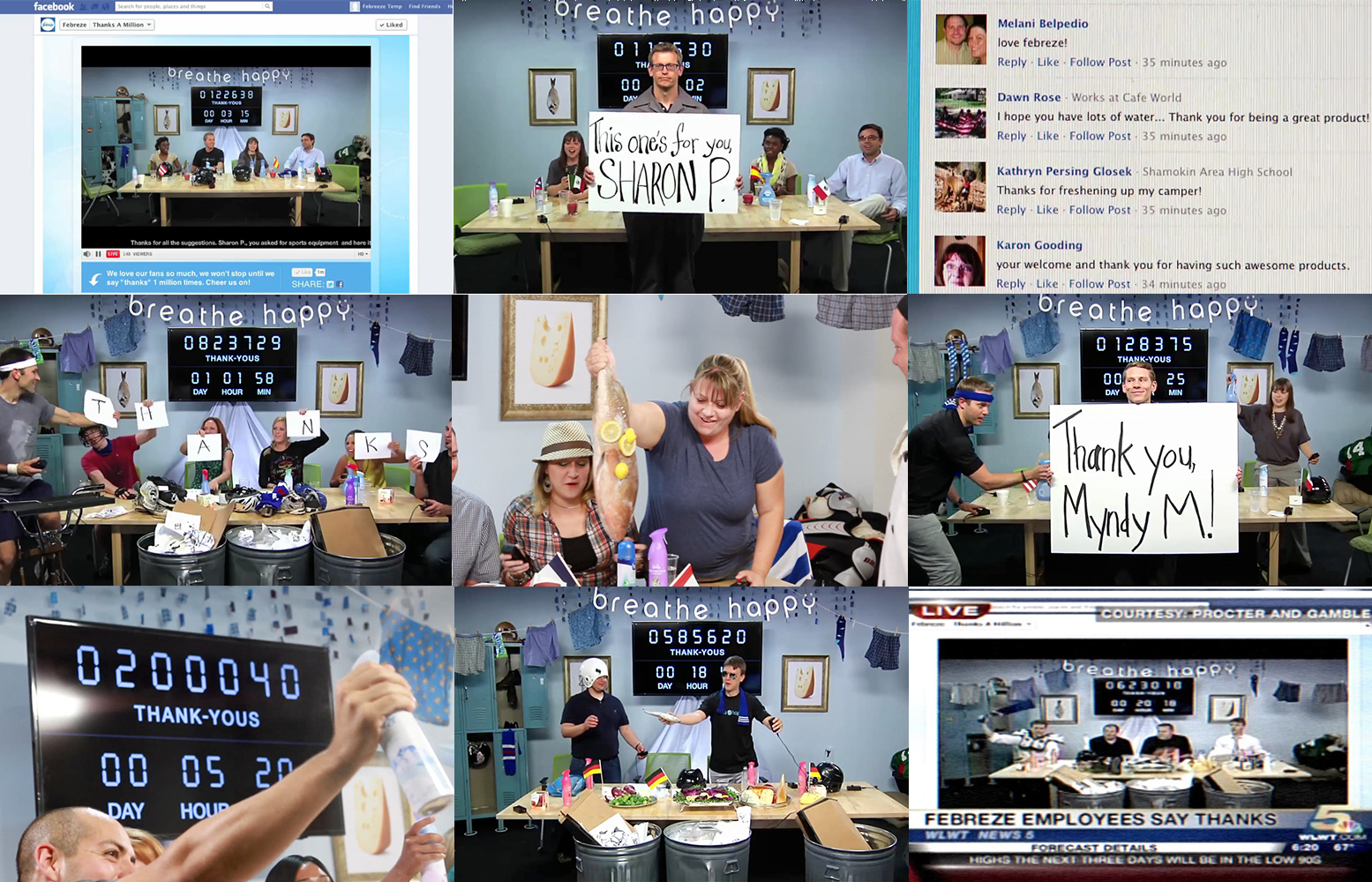 When Febreze reached the 1-million-fan mark on Facebook, we locked the brand team in the studio until they said “thank you” one million times, as fans sent then smells to combat only with Febreze, and we broadcasted it live before Facebook Live even existed.